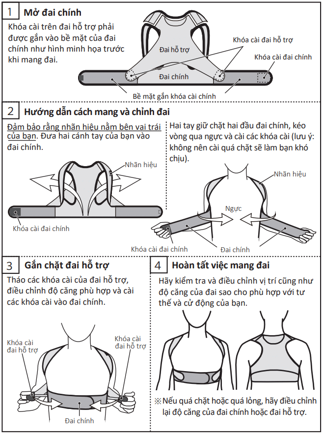 - Đai chính (lớp trong): thiết lập vị trí đai và độ siết vòng ngực vừa vặn không gây nén chặt vòng ngực.