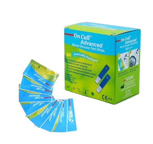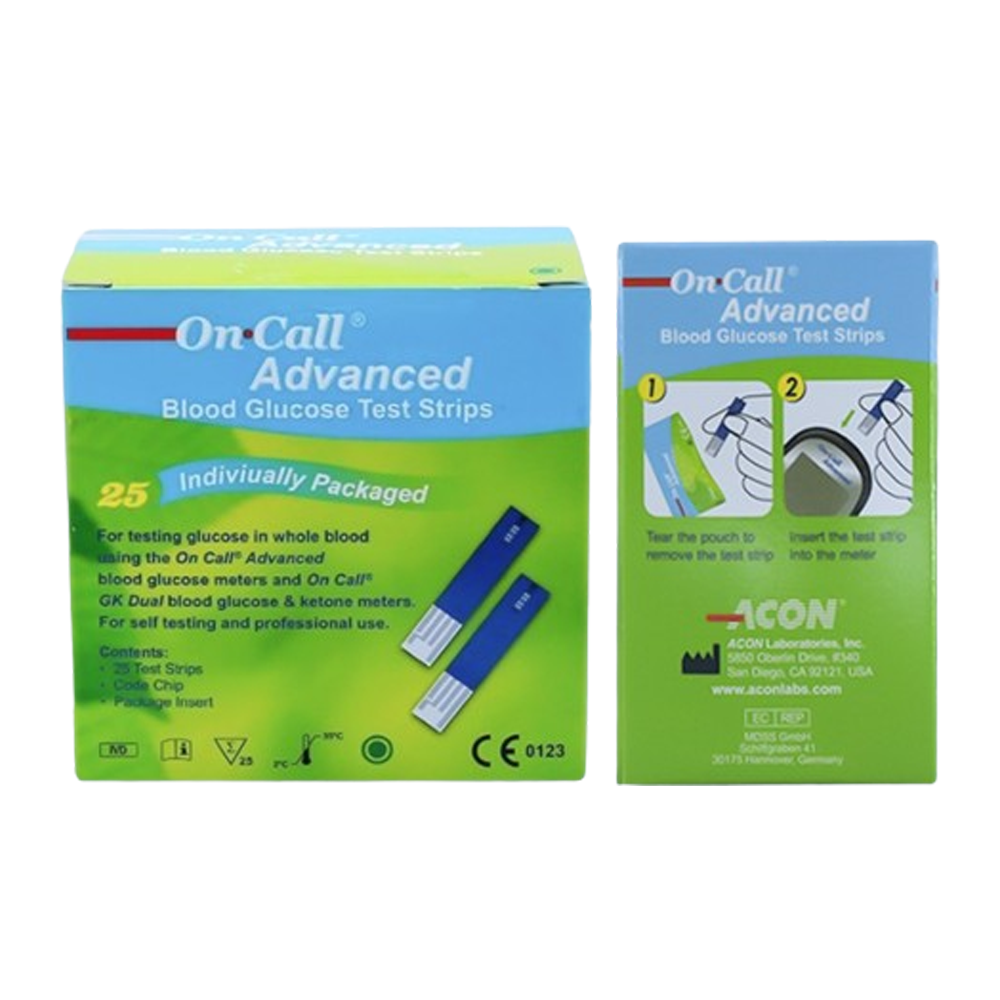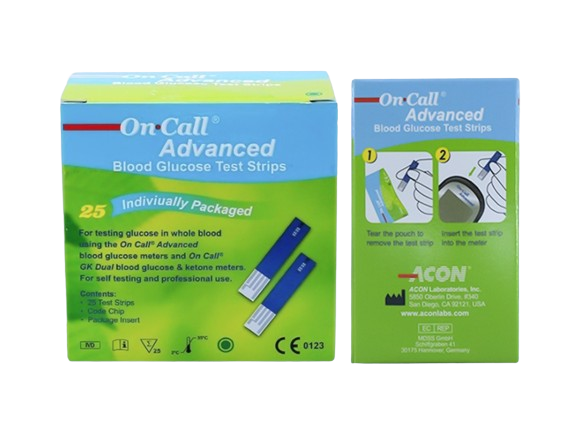 - Tên sản phẩm: Hộp 25 que thử đường huyết On Call Advanced
