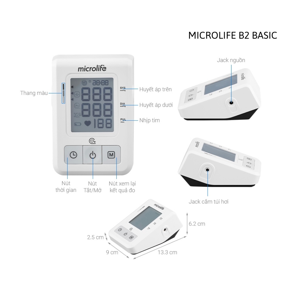 - Khả năng sử dụng nguồn điện: Ngoài việc sử dụng pin, Microlife B2 Basic còn có thể hoạt động với bộ đổi nguồn DC (bán riêng), giúp tiết kiệm chi phí pin trong trường hợp sử dụng thường xuyên.