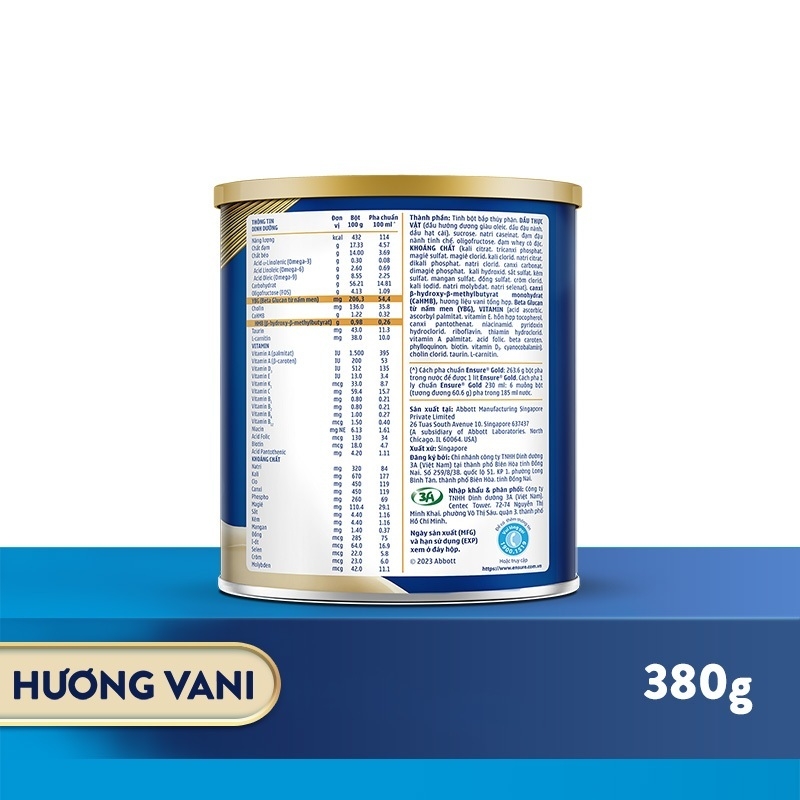 Sữa Ensure Gold Hương Vani 380g là sản phẩm dinh dưỡng y học dạng bột, được thiết kế đặc biệt để cung cấp nguồn dinh dưỡng đầy đủ và cân bằng cho người trưởng thành, đặc biệt là người cao tuổi. Sản phẩm có hương vị vani thơm ngon, dễ uống, và được đóng gói trong hộp thiếc 380g tiện lợi.